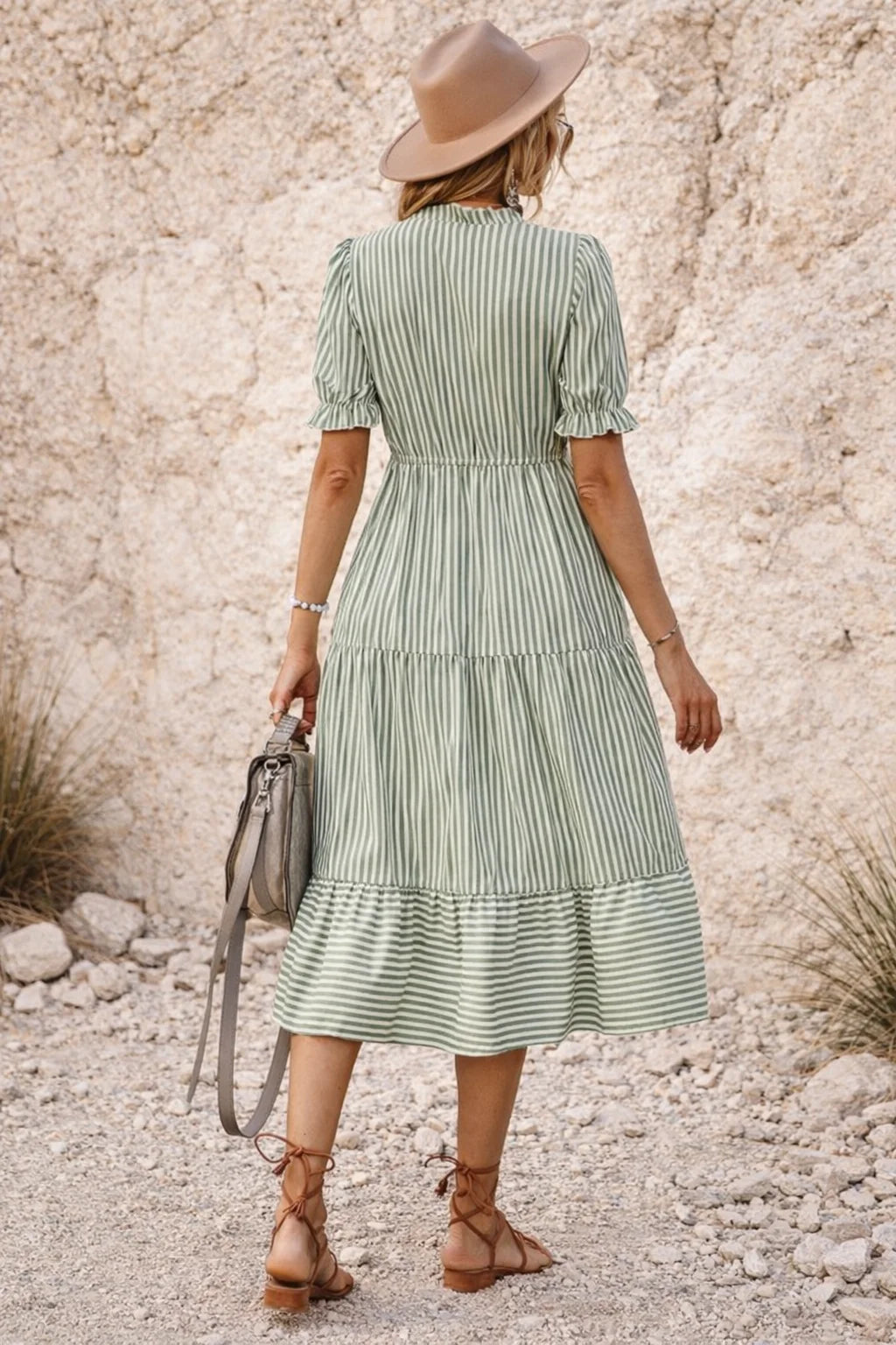 Laissez-vous séduire par notre robe bohème vert sauge, essentielle pour un été léger et stylé. Avec ses rayures fines blanches, elle promet une allure chic et décontractée.