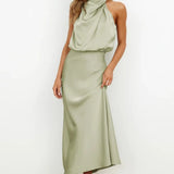Cette robe se distingue par son col drapé haut, une coupe sophistiquée qui ajoute immédiatement une touche couture. Le bustier blousant offre un tombé fluide et naturel, tandis que la jupe midi évasée accompagne chaque mouvement avec légèreté. Sa texture satinée capte la lumière avec subtilité, créant un effet soyeux luxueux. Le dos fendu avec bouton apporte une finition élégante et délicate alliant modernité et minimalisme.